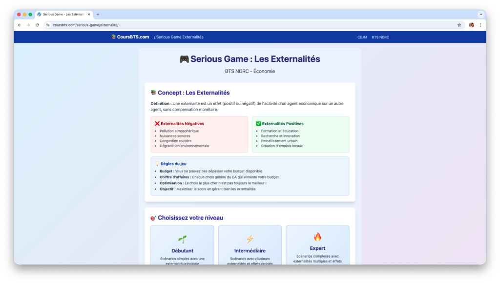 Le serious game sur les externalités propose trois niveaux de difficulté progressifs : débutant, intermédiaire et expert. Cette approche personnalisée garantit que chaque utilisateur, qu’il soit lycéen découvrant le concept ou étudiant BTS NDRC approfondissant ses acquis, trouve un challenge adapté à son niveau.